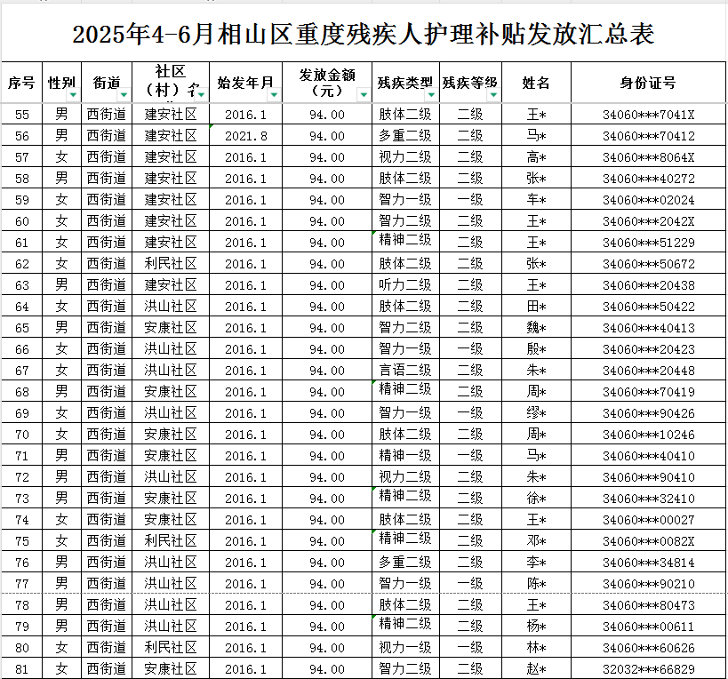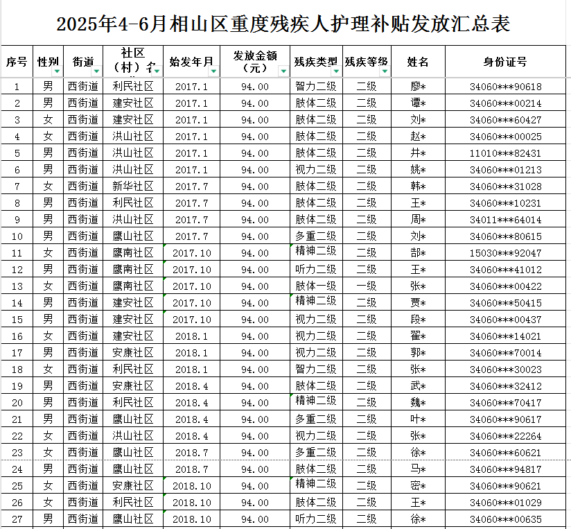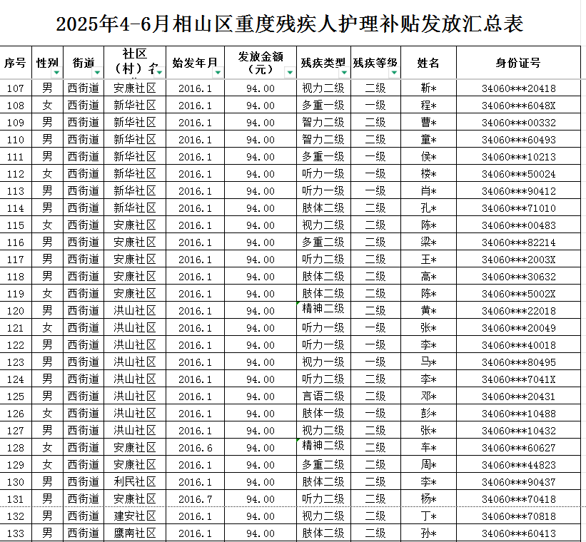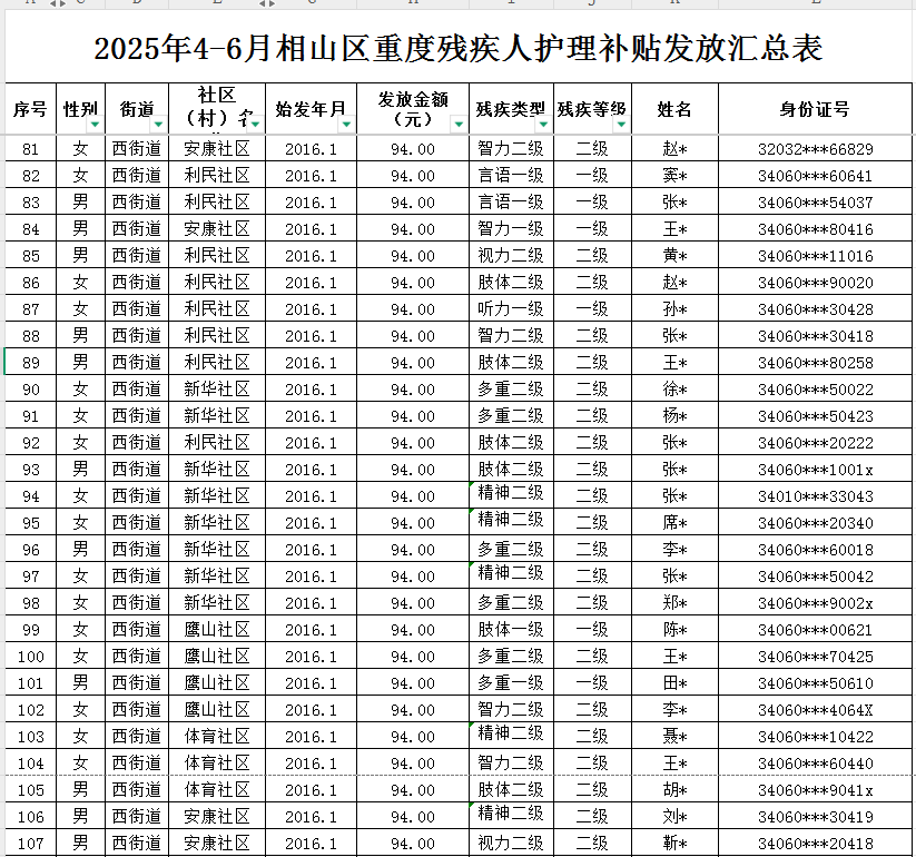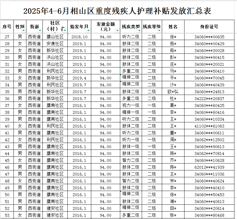 西街道2025年第二季度重度残疾人护理补贴发放汇总表