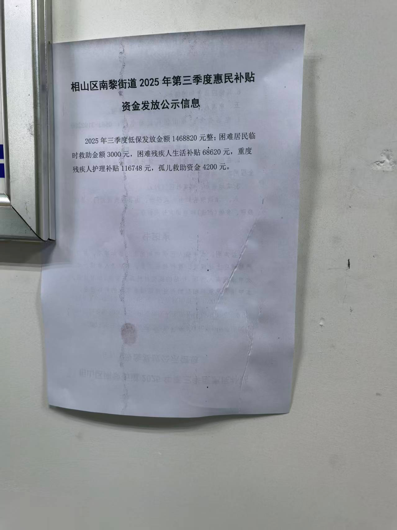 2025年三季度低保发放金额1468820元整;困难居民临时救助金额3000元,困难残疾人生活补贴68620元,重度残疾人护理补贴116748元,孤儿救助资金4200元。