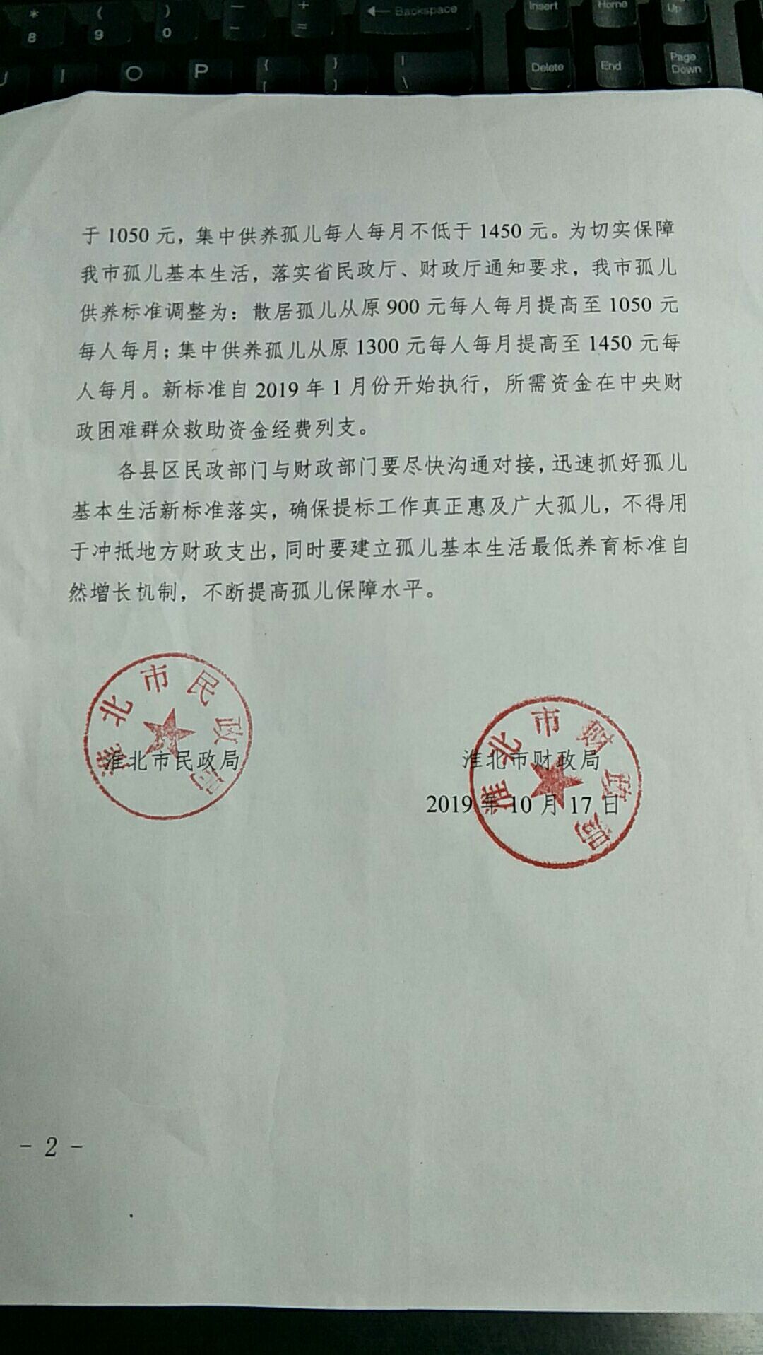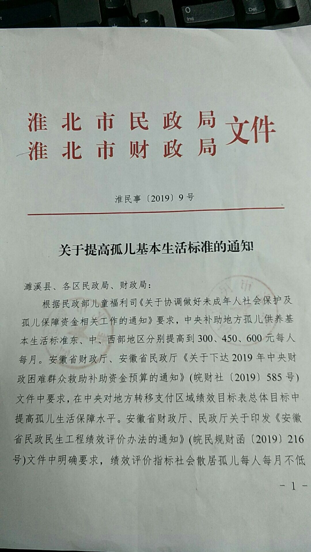 关于提高孤儿生活标准的通知