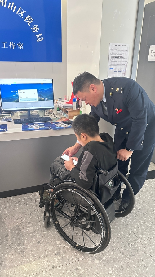 近日,行动不便的纳税人冯先生独自来到相山区税务局办税服务厅。进门伊始,他的身影便引起了众人的关注,税务人员第一时间上前询问,得知是要办理发票开具业务,便亲自推着他来到二楼自助区。