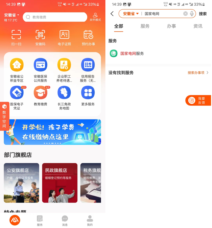 下载“皖事通”APP并注册登录,在首页搜索框搜索“国家电网服务”,点击进入。