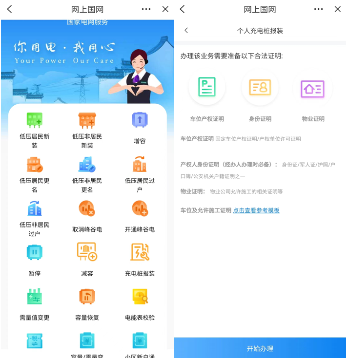 在服务页面,选择“充电桩报装”服务,查看办理业务需要准备的证明材料后点击“开始办理”。