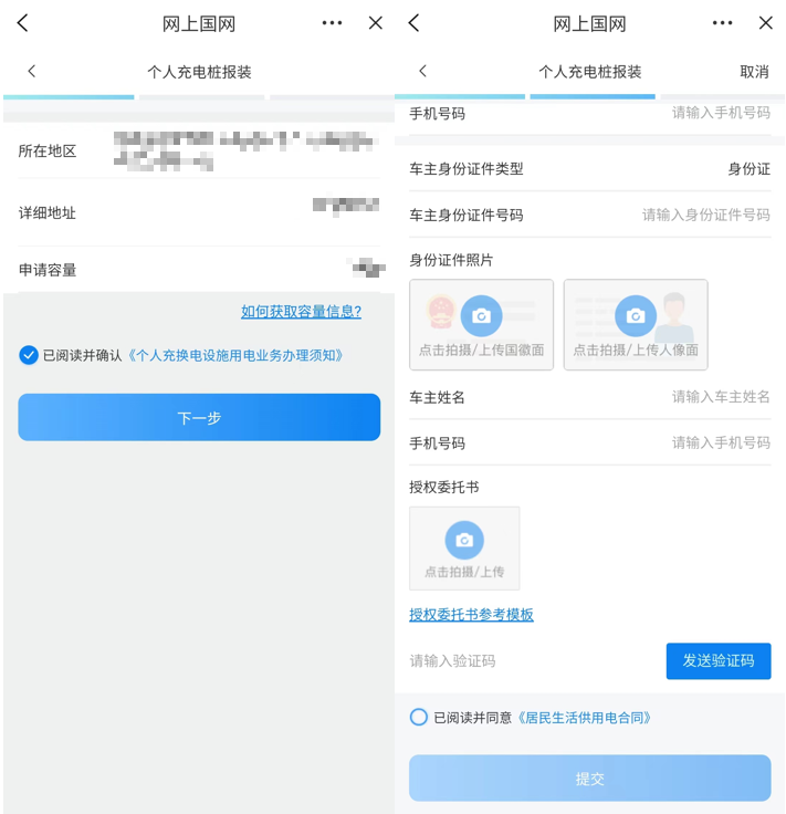 填写所在地区、详细地址、申请容量以及车主相关等信息,上传相关材料后,点击提交即可。