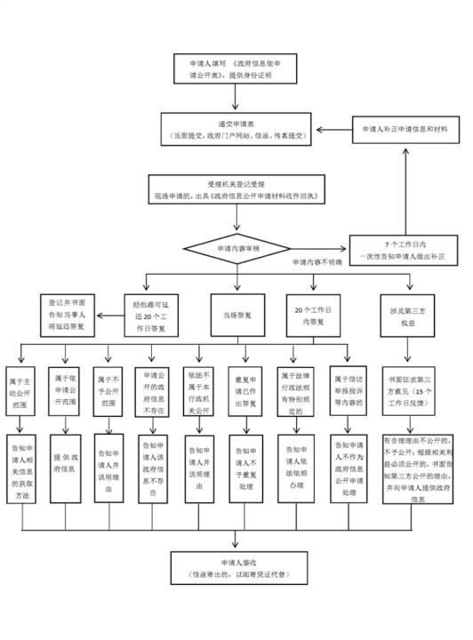 本机关收到申请后,将对申请内容进行审查,政府信息公开申请内容不明确的,要求申请人补正。行政机关收到政府信息公开申请,能够当场答复的,应当当场予以答复。行政机关不能当场答复的,应当自收到申请之日起20个工作日内予以答复;需要延长答复期限的,应当经政府信息公开工作机构负责人同意并告知申请人,延长的期限最长不得超过20个工作日。申请公开的政府信息涉及第三方权益和其他机关的,本机关将征求第三方和其他机关的意见,征求第三方和其他机关意见所需时间不计算在上述规定的期限内。